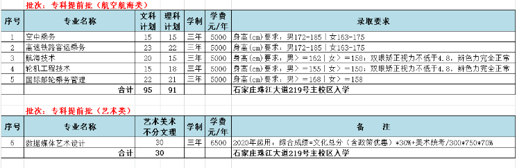 學院現有在校大學生14000余名。2020年招生計劃5300人(不含3+2轉段,較往年增加600人),其中河北省高職單招已錄取2350人,省外投放538人,省內剩余計劃2412人(考生填報志愿學院代號0650普通文科考生依據河北省教育考試院編考試與招生《2020年河北省普通高等學校招生計劃》文科含對口招生冊:文史專科提前批第125頁,專科批第146-147頁,藝術類美術統考專科提前批第246頁,對口專科批財經類第290頁,對口專科批機械類第294頁,對口口專科批電子電工類第296頁,對口專科批建筑類第297頁,對口專科批計算機類第299頁,對口專科批旅游類第302頁。理工類考生依據《2020年河北省普通高等學校招生計劃》理科招生冊:理工專科提前批第287頁,專科批第311-312頁,藝術類美術統考專科提前批第416頁)。各批各類分專業招生計劃如下: